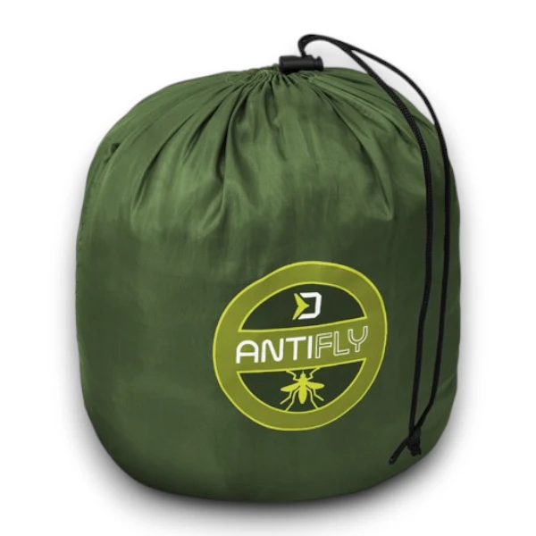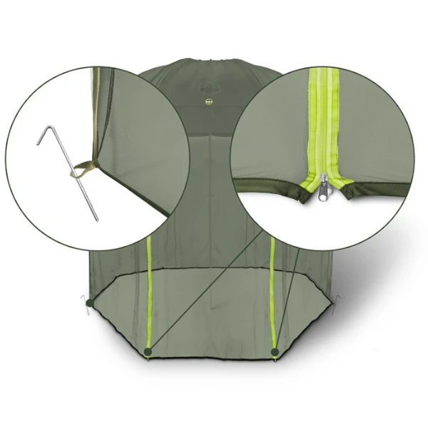 A bejáratot két fényvisszaverő színű cipzárral láttuk el, hogy éjszaka és kedvezőtlen fényviszonyok között is könnyebben tájékozódjunk. A finom háló nem enged be semmilyen nem kívánt társat az ernyő alá.