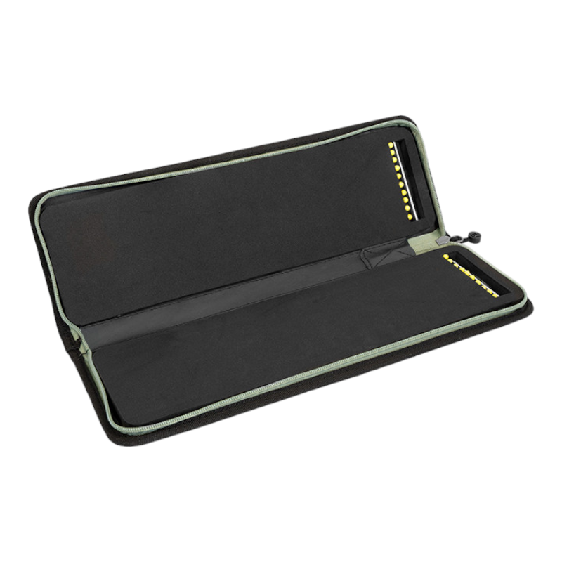 A Delphin Rig LOONG SPACE C2G egy új, meghosszabbított tok, amely új szintre emeli a hosszú előkék szervezését és védelmét. Ezzel a tokkal soha nem fogja az idejét csomók kibogozásával vagy új szerelékek fárasztó vízparti kötözésével vesztegetni, amikor nagy a halak aktivitása. Ahogy a neve is sugallja, a tokot arra tervezték, hogy akár 38 cm-es hosszúságú, előkészített szerelékeket tároljon, így biztosítva, hogy azok mindig egyenesek és azonnali használatra készek legyenek! A tok egyszerű felépítésű, belseje tartós edzett habból készült, két kivágással. A kivágások acélrudakat tartalmaznak a szerelékek horgainak rögzítésére. A szerelékek habszivacshoz való rögzítéséhez a tok 20 tűvel van felszerelve, amelyek bőséges teret biztosítanak az előkészített szerelékeknek, ezt pedig a kezdő horgászok és a tapasztalt versenyzők egyaránt értékelni fogják. A tok külseje megerősített és tartós anyaggal borított. A tok fém húzókával szerelt cipzárral rendelkezik, amelyet stílusos Delphin logó díszít.