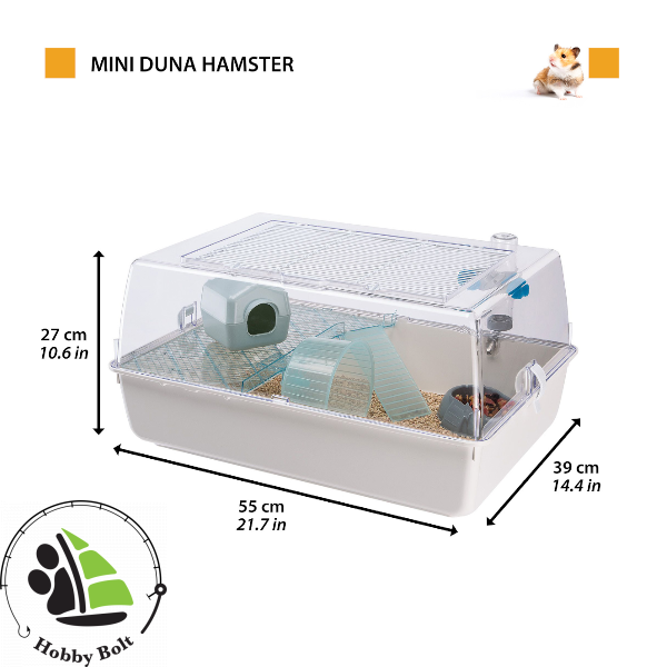 A tömör műanyagból készült Mini Duna Hamster egy hörcsög- és egérketrec, amelynek átlátszó teteje a levegő átjárhatóságát biztosító hálós ráccsal van ellátva. A rács karbantartás céljából teljesen kinyitható. A tető felső részén két kis forgó kapcsot helyeztek el, amelyek szorosan zárva tartják a rácsot, hogy az állat számára maximális biztonságot nyújtsanak. Az élőhelye egy speciális, átlátszó műanyagból készült belső polcon van. Lehetővé teszi az állat tökéletes láthatóságát, és amelyhez egy kényelmes létrán tud hozzáférni. Végül az oldalsó kapcsok kiakasztásával könnyen szétválaszthatja az alját és a tetőt, hogy folytathassa a szokásos karbantartási műveleteket.