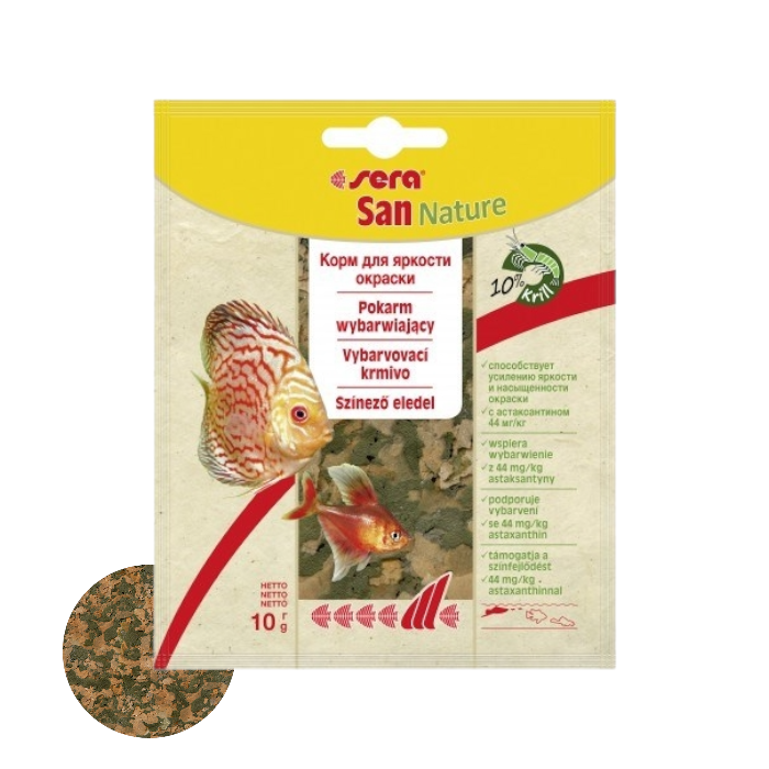 sera San Nature természetes alapanyagokból készült lemezes színezőtáp, amely mentes minden színezéktől és tartósítószertől. A színfokozó hatást kizárólag természetes összetevők biztosítják, mint pl. az astaxanthin-ban gazdag Haemattococcus alga és a Krill. Ezzel együtt javul a halak élénksége, valamint az ívásra való hajlamuk is. A lemezek megtartjákalakjukat, alkalmas minden vízfelszínről táplálkozó halnak.