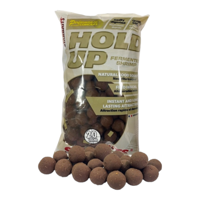 HOLD UP fermentált (erjesztett) garnélarákhús keveréke állati eredetű összetevőkkel kombinálva, rendkívül erős illattal. A vízbe juttatás után a bojlik azonnal erős vonzerőt bocsátanak ki és nagy távolságból is gyorsan magukhoz vonzzák a nagytestű pontyokat. Emellett a fermentált összetevők jelentősen felgyorsítják a bojlik emészthetőségét (a hal nem fog telítődni), ezért a Hold Up masszív etetéshez is ajánlott.