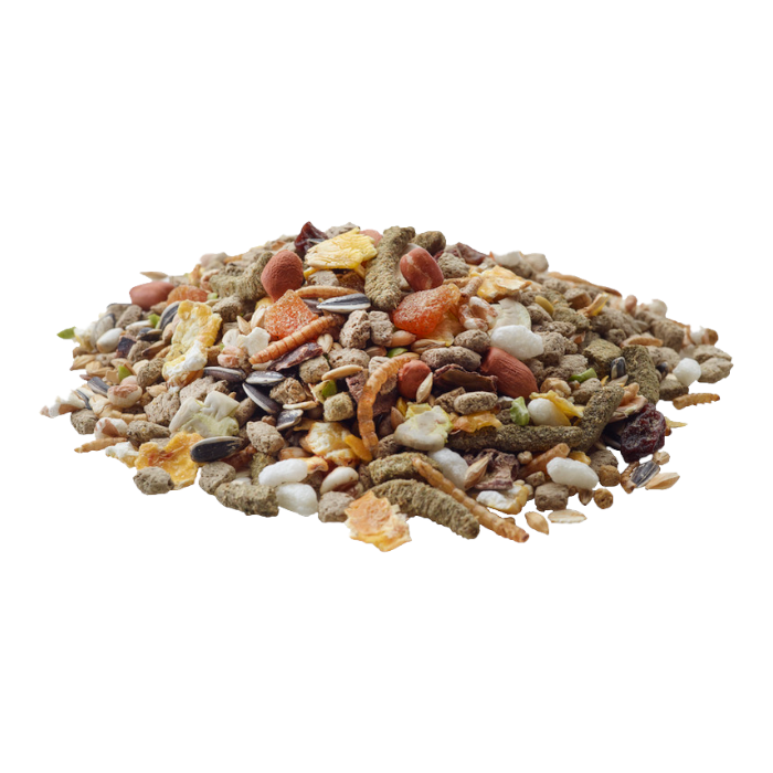 Összetevők: gabonafélék, zöldség származékok, zöldségek (zöldborsó 12%), magvak (hántolt napraforgómag 6%), növényi fehérje kivonatok, gyümölcs (sárgabarack 1,5%, aszalt szőlő 1%), diófélék, rovarok (lisztkukacok 4%), ásványi anyagok, élesztő, olajok és zsírok, gyógynövények, MOS, FOS, körömvirág, szőlőmag