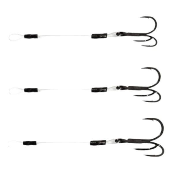 75-ös sorozatú tűhegyes, szakállas hármashorogból készült szerelék.